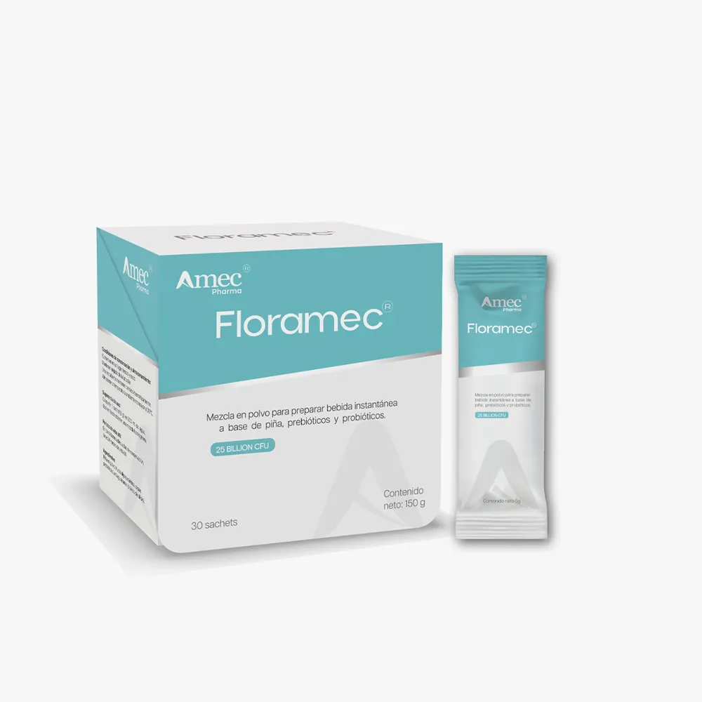Floramec® es un simbiótico clínico de nueva generación diseñado para proporcionar efectos antiinflamatorios más eficaces. Su fórmula estable, segura y libre de alérgenos está desarrollada con tecnología clínica flora-focus, utilizando cepas respaldadas por evidencia clínica internacional.